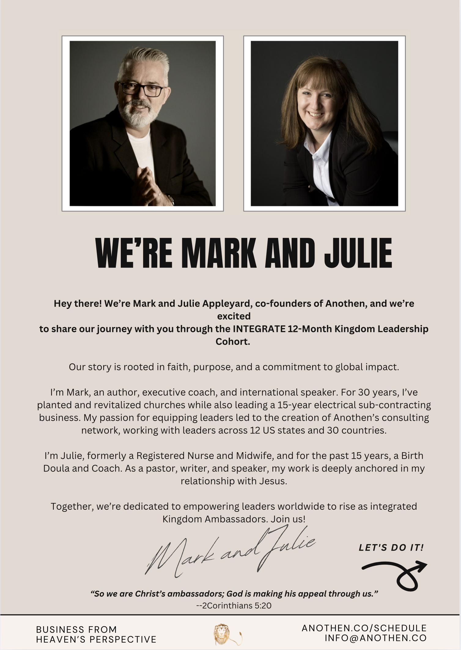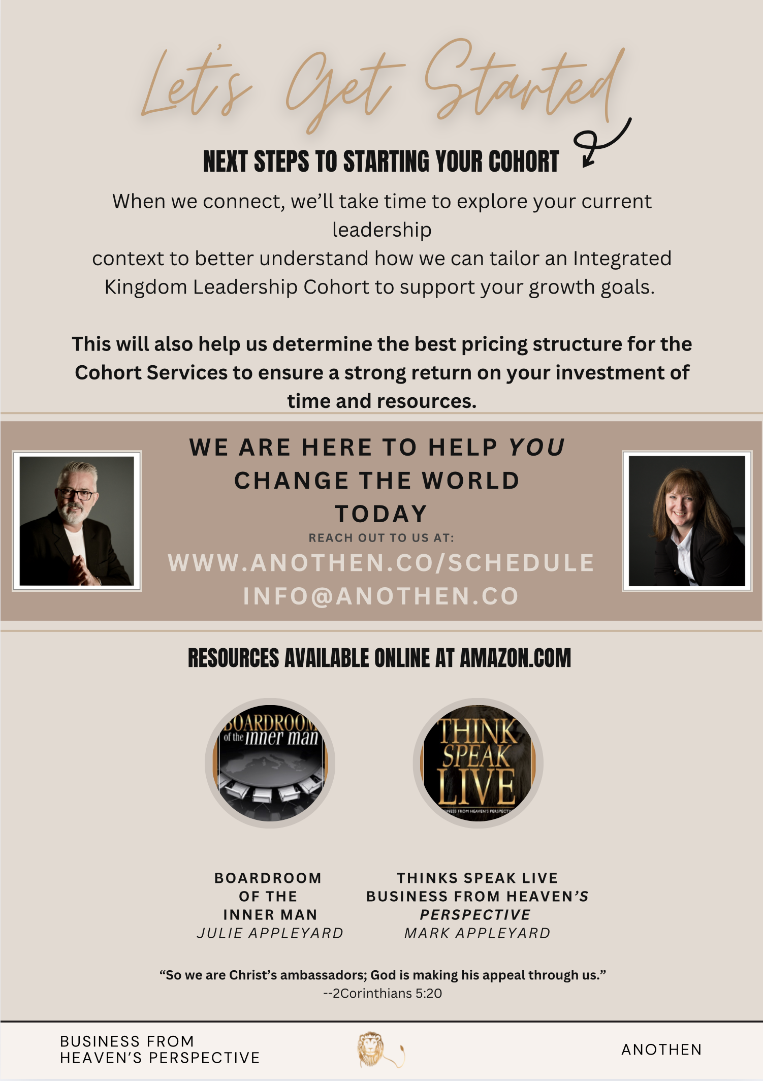 Imagine having a Business Pastor in your corner every day to help you with your personal, family and business life. Imagine someone who would have your leadership success and business breakthroughs at heart, who has the capacity to hear from heaven while coaching you to do the same. Imagine having access to Kingdom Business insights that have been gleaned from across 20 different nations… Welcome to Anothen Business Consulting. We have been equipped to help you "Think, Speak and Live" on earth as it is in heaven.